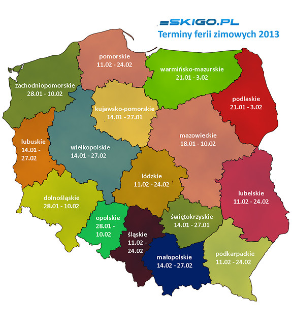 W 2013 roku pierwsi, bo 14 stycznia, na ferie zimowe doczekają się uczniowie z województw kujawsko-pomorskiego, lubuskiego, małopolskiego, świętokrzyskiego i wielkopolskiego. Tydzień później, 21 stycznia, ferie rozpoczną się w województwie podlaskim i warmińsko-mazurskim. Następnie, od 28 stycznia, ferie zawitają do województw dolnośląskiego, mazowieckiego, opolskiego i zachodniopomorskiego. Najpóźniej ferie odbędą się w województwie lubelskim, łódzkim, podkarpackim, pomorskim i śląskim, dopiero 11 lutego.
